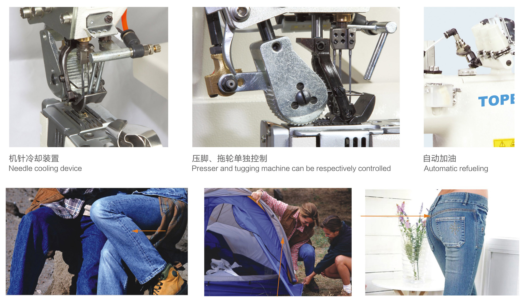 TF-9588 it is our latest feed-off-the -arm machine which adopt the latest technology. Suitable for men's suit, suit dress, shits, jeans for light medium and extra heavy duties, working clothes, leisure trousers. tents, rain coat, etc.